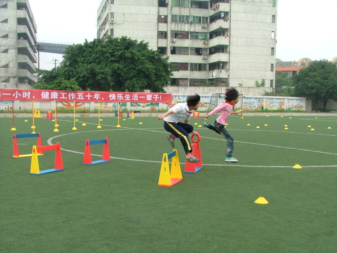 那边,圆形的跑道上摆着矮矮的跨栏、高高的障碍杆。小运动员先要在垫子上做一个前滚翻,然后全速平跑,绕过障碍杆,跨越栏架,最后将手中的圆圈交给下一位队员,这叫“一级方程式”组合跑,结合了短跑、跨栏跑和绕障碍杆跑,孩子们跑得满头大汗,但玩得很开心。