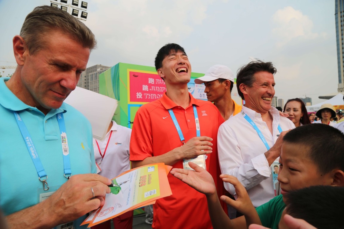刘翔、国际田联主席迪亚克与撑高跳沙皇布勃