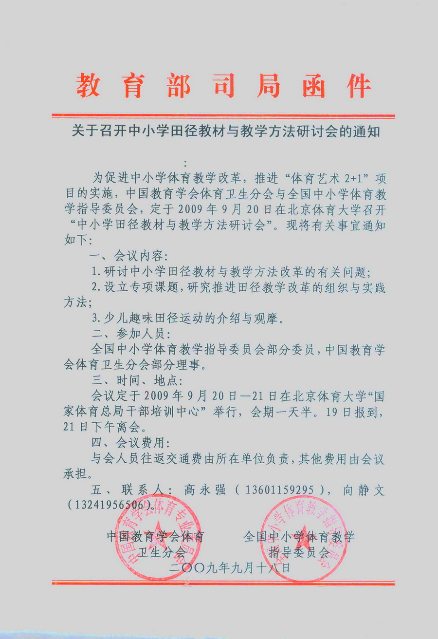 关于召开全国中小学田径教材与教学方法研讨会的通知