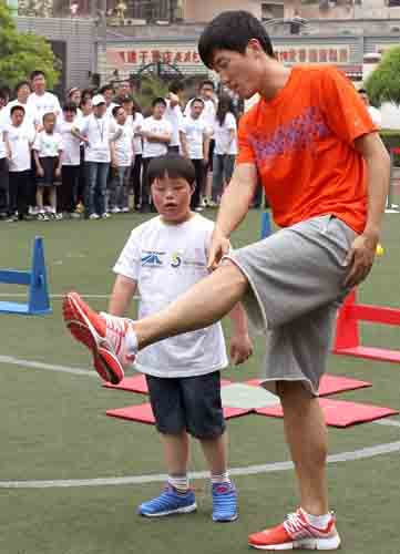 最后,领先到达终点的刘翔还特意做了一个冲刺的甩头动作,乐得旁观的孩子们直拍手。第一次接触少儿趣味田径的孩子们显得十分兴奋,组成了拉拉队为游戏中的同伴呐喊助威。参与活动的田径明星们也十分投入,非常耐心地与孩子们进行互动。