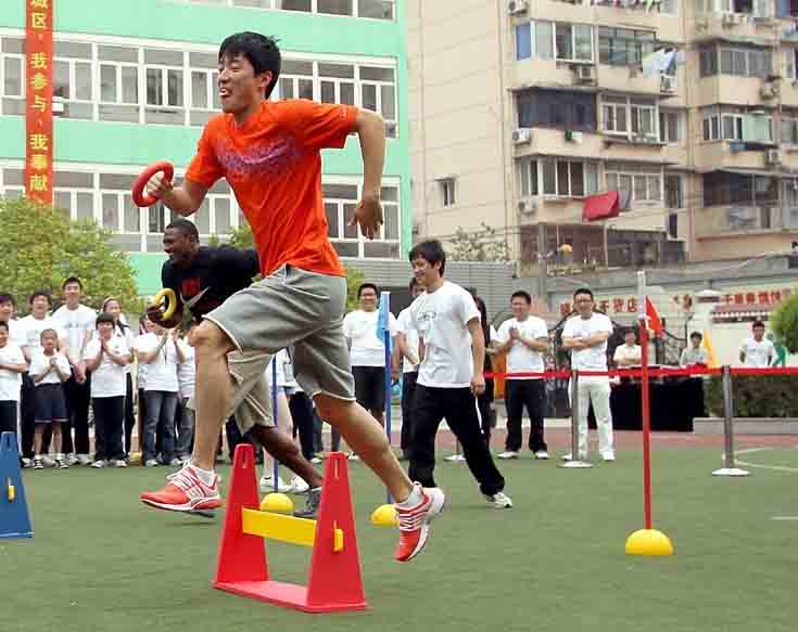活动当天,明星们分组和孩子进行了20米接力跨栏、10米跑步梯折返跑等少儿趣味田径游戏比赛。昊昊和刘翔也成为了“队友”,美国名将奥利弗则和另一位孩子搭档,进行了一场少儿趣味田径特别的“跨栏”比赛。