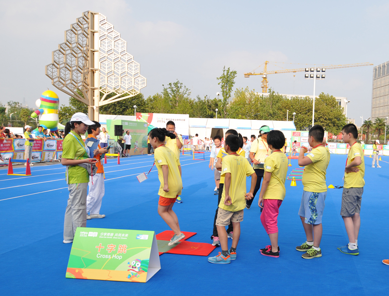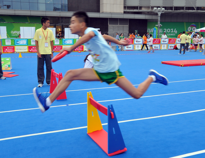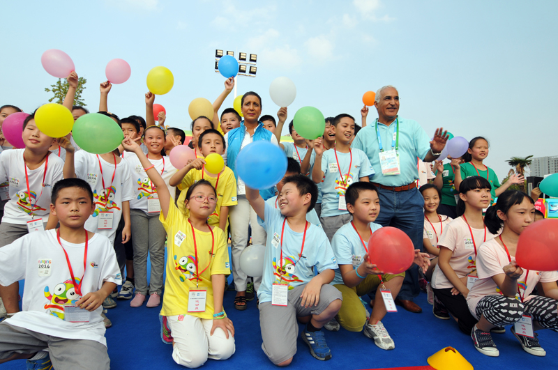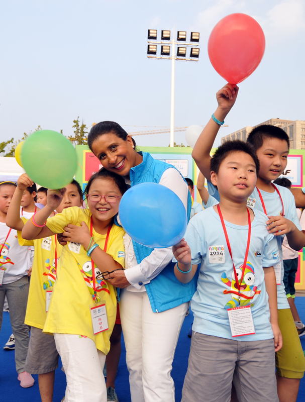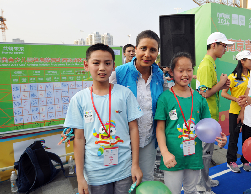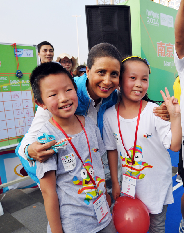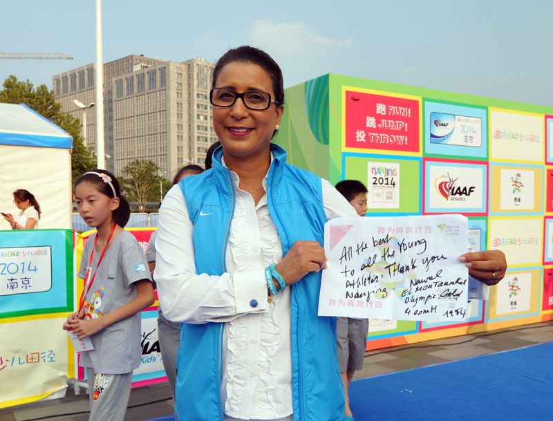 8月21日下午,河西万达广场南京青奥会少儿田径启蒙活动进行的如火如荼,小运动员们有的在跨栏,有的在接力,有的在撑杆跳,有的在掷标枪等。5时许,国际奥委会第一副主席纳瓦尔·埃尔·穆塔瓦基尔(Nawal El Moutawakel),1984年洛杉矶奥运会女子400米栏金牌得主,在国际田联官员的陪同下来到孩子们中间,与他们亲切交流合影留念,令孩子们开心不已。她还应邀在《我为青奥代言》上留言:“祝年轻运动员好运,感谢南京”并签名。