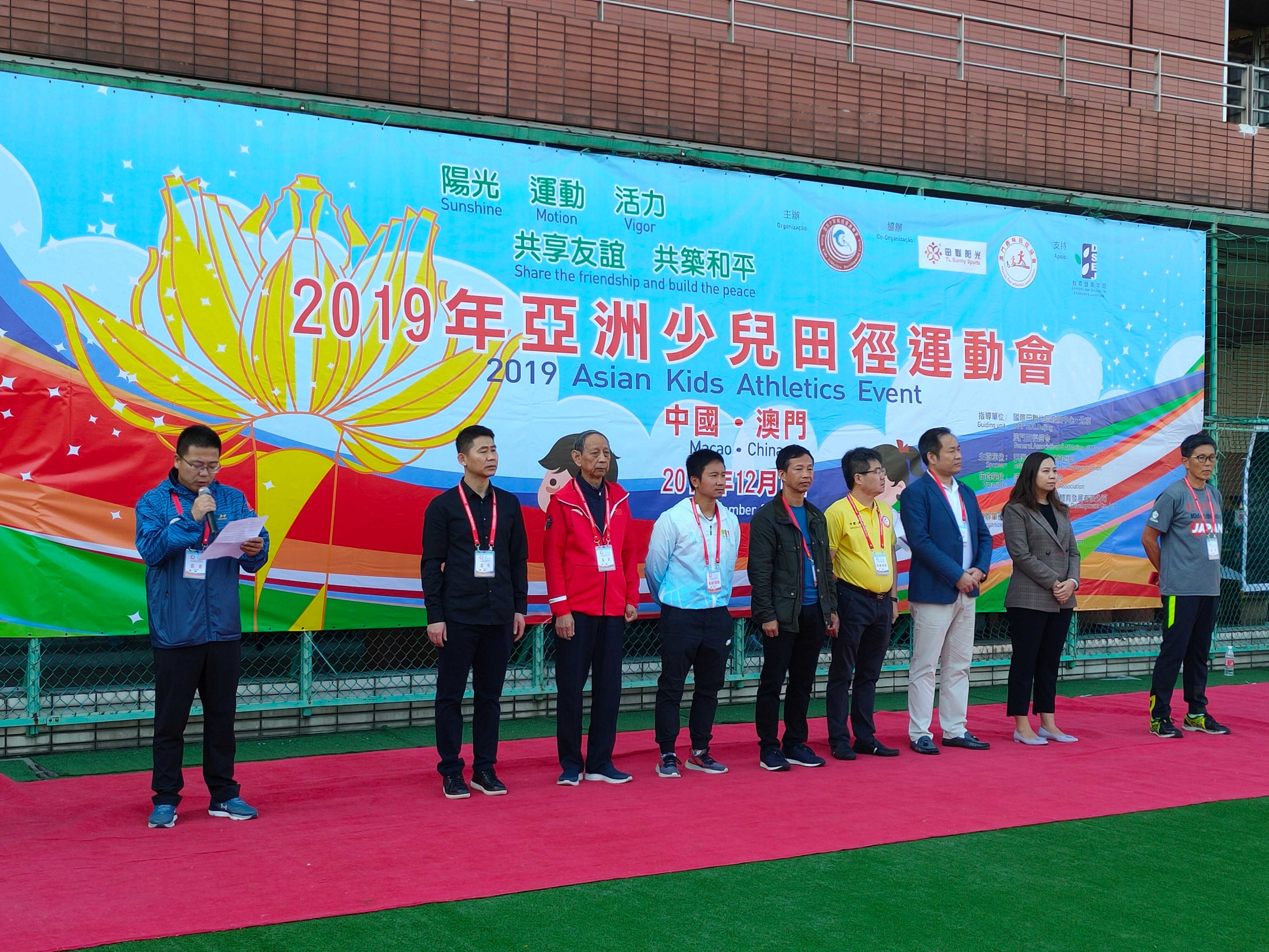 由国际田联地区发展中心·北京和澳门田径总会指导,由亚洲少儿田径发展联盟主办,澳门趣味田径协会和田联阳光(北京)体育发展有限公司承办的2019年亚洲少儿田径交流活动在澳门拉开帷幕,作为此次活动第一项议程的少儿田径比赛于12月1日在澳门关闸工人体育场成功举办。来自中国大陆、香港、澳门、日本及马来西亚等众多国家及地区的200多名运动员参加了此次比赛。亚洲少儿田径发展联盟理事长小林敬和、秘书长高永强,中国澳门田径总会副理事长陈步倩,中国澳门趣味田径协会会长吕子安、副会长庄铭雄、理事长林金塔,田联阳光(北京)体育发