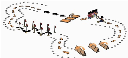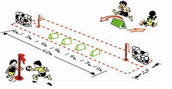 (一)跨栏跑接力方法:器材的放置如上图所示。每队按照迎面接力队形站好准备,听到口令后第一名队员迅速出发,与对面队友交接,当各队的队员都完成了跨栏跑后,比赛结束。比赛活动中要求队员右手传接力圈。